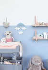 Det fine grå puslebord er fra mærket BudtzBendix. Hylder med læderstropper fra Hübsh, regnbuen på væggen fra CamCam, den lille kat musikuro er fra Konges Sløjd, kaninen er fra Jellycat og dukken på puslepuden er fra Luckyboysunday.