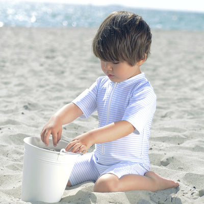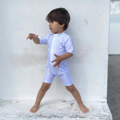 Stribet UV dragt fra Petit Crabe med korte ærmer og ben samt YKK lynlås. Brug den med en solhat for maximal beskyttelse af dit barn. Dragten har solbeskyttelsesfaktor UPF50+, som blokerer for 98% af solens skadelig stråler. Er fremstillet i Øko-Tex materialer og består af 80% polyamid og 20% Elanstan/Lycra. Et åndbart og hurtigttørrende materiale, der har en perfekt balance mellem letvægt og elasticitet, som gør det meget behagelig at have på.