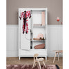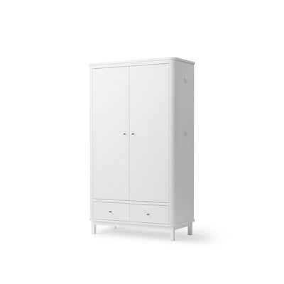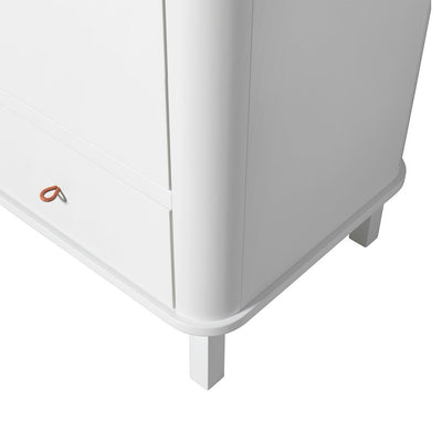 Flot og rummeligt klædeskab i hvidt træ, fra danske Oliver Furniture. Klædeskabet er på hvid sokkel og er fra serien Wood Collection, som rummer børnemøbler i moderne nordisk stil. Skabet er indrettet med en gennemgående bøjlestang øverst og 4 flytbare hylder, som kan placeres helt efter eget ønske. På hver side af skabet er der 2 runde knager, som nemt kan skubbes ud fra indersiden af skabet, til ophæng af bøjler, morgenkåbe mm. I nederste del af skabet er der 2 rummelige skuffer med soft lock funktion, der er perfekt til opbevaring af bla. sko. Som noget særligt er der lædergreb som håndtag, der giver et flot visuelt udtryk.
