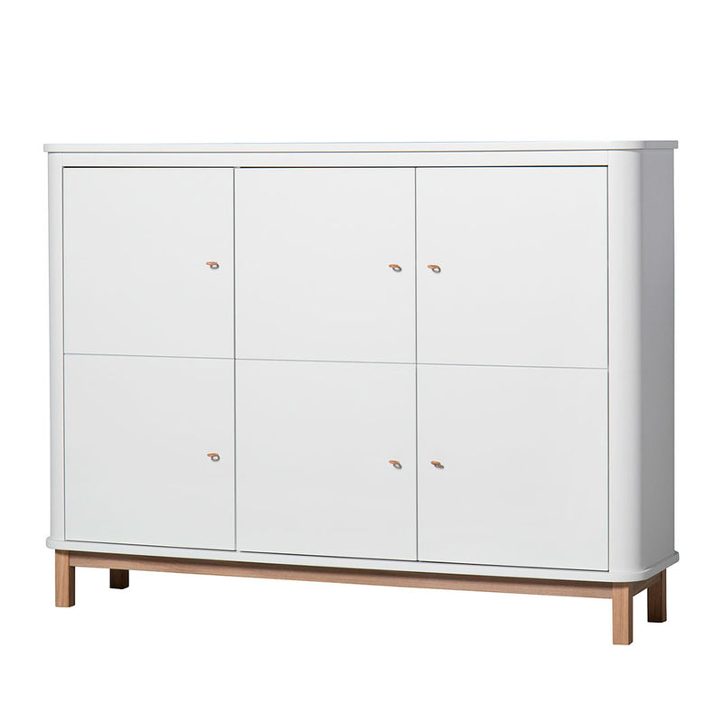 Wood multiskab fra danske Oliver Furniture er ideelt til opbevaring af tøj, legetøj og samleobjekter, eller som et lille klædeskab i hjem med skråvægge på grund af dets beskedne højde. Multiskabet har 3 låger m. kernelæder greb, og er fremstillet i hvidt træ med sokkel i egetræ. Skabet er fra serien Wood Collection, og leveres med en gennemgående fastmonteret hylde samt 2 smalle og 2 brede hylder, som kan monteres efter eget ønske.