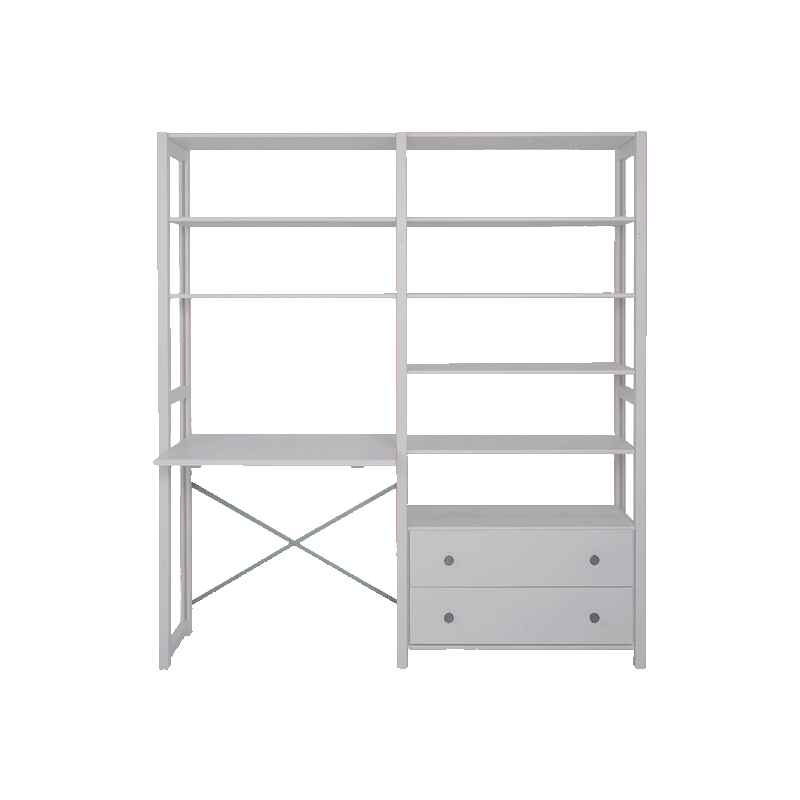 Modelfoto viser reol i højde på 179 cm og dybde 40 cm - bemærk at skrivebordspladen er 60 cm i dybden. Reolen leveres usamlet og som fladpakket.