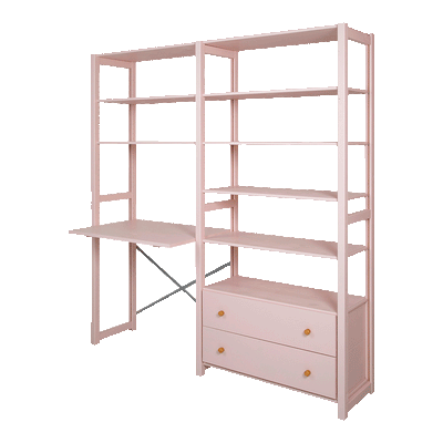 Modelfoto viser reol i højde på 179 cm og dybde 40 cm - bemærk at skrivebordspladen er 60 cm i dybden. Reolen leveres usamlet og som fladpakket.
