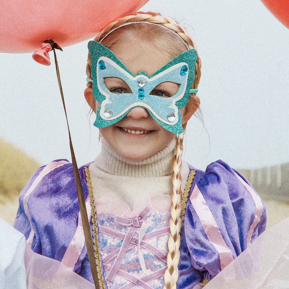 Flot dyremaske med glimmer til fastelavn og udklædning. Fås i 4 forskellige udgaver som sommerfugl, enhjørning, kat og tiger. Masken er designet med elastik om nakken. Fra 3 år og opefter. Vælg model.