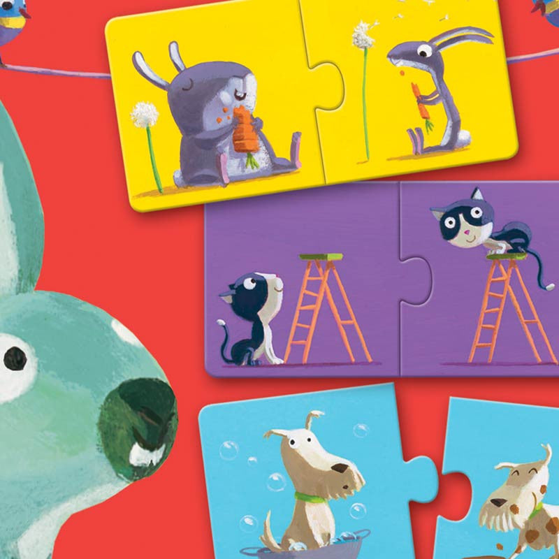 Hvert puslespil har 2 brikker med motiver, som skal passe sammen, og er velegnet til de lidt mindre børn.