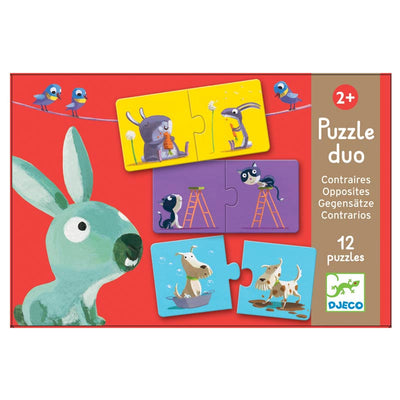 Underholdende og lærerige puslespil fra Djeco bestående af 12 forskellige motiver, der viser modsætninger eks. ren og beskidt, stor og lille og dag og nat.