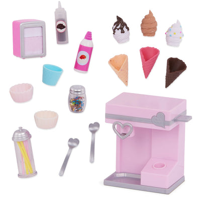 Hvad skulle det være?....? I vaffel eller i bægre, fineste ismaskine fra Our Generation, men mange søde detaljer. Flot sæt med tilbehør til dukker fra Our Generation. OBS: Dukkerne medfølger ikke.