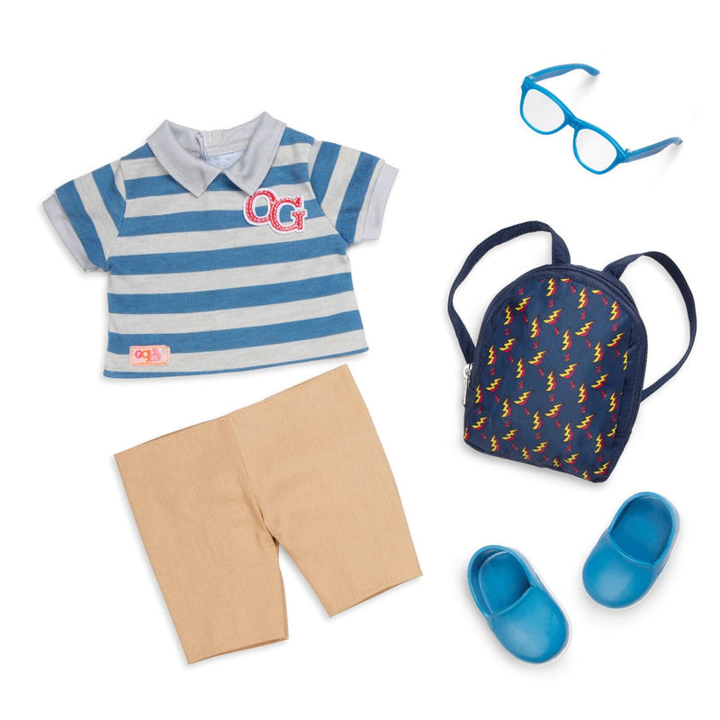Leo har første dag på OG-universitetet og han glæder sig. Tasken er pakket og han har taget noget pænt men afslappende tøj på, så nu er han helt klar til at møde sine medstuderende. Til Our Generation dukken medfølger: Poloshirt, shorts, sko, briller og en smart skoletaske.