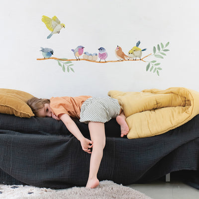Sæt præg på børneværelset med vægklistermærker fra Mimi´Lou. Denne flotte frise med wallstickers har motiv af gren med kvidrende fugle, der er lige klar til at blive klistret på væggen. Samlet længe 73 cm.
