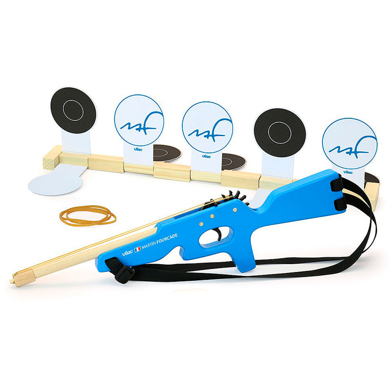 Et skydesæt fra Vilac, så du med elastikker og skiskydningsriffel kan skyde efter mål som en verdensmester. Indeholder blå riffel i træ, samt skydemåk og 20 elastikker. Fra 5 år.