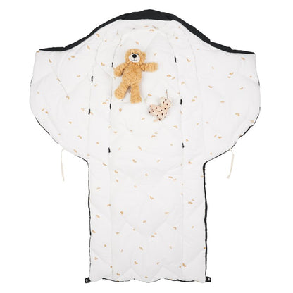 To huller på ryggen af posen gør det muligt at montere posen med en 2-punktssele. (BEMÆRK: Denne pose vil ikke passe i et sæde med integreret 5-punktssele). Når du breder soveposen ud, kan den bruges som et stort legetæppe.