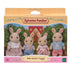 Sød kaninfamilie fra Sylvanian families. Familien består af 4 medlemmer, der er klædt i pink og blå outfits, der kan tages af og lukkes vha. velcro. Dyrene er lavet med en blød pelsagtig overflade, og har arme, ben og hoved kan drejes, så de f.eks. kan sidde ned. Måler ca. 6-8 cm