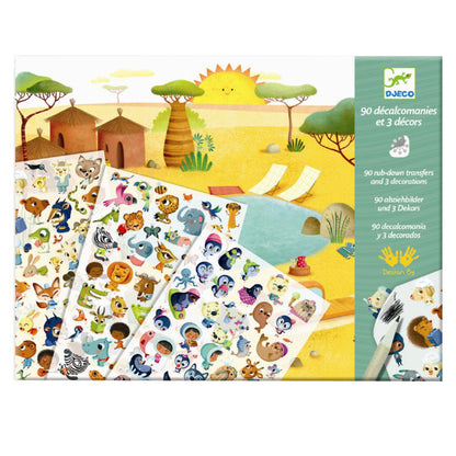 Kreativ aktivitet med overførings motiver fra Djeco. En klassisk gammeldags aktivitet hvor man kan gnubbe motiver over på et baggrundsbillede, og lave de mest fantastisk fantasibilleder, helt efter eget ønske. Denne model indeholder finurlige motiver af vilde dyr til fest. I alt 3 baggrundsbilleder og 2 ark med ca. 90 overføringsmotiver.