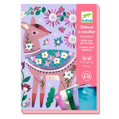 Lav 4 flotte dyre billeder med flotte blomster dekorationer. Fjern dækpapiret fra et felt og skrab en af folie farverne på med den smarte spatel. Fortsæt processen til alle felterne er udfyldt. Billederne får et smukt og skinnende look, med de 15 flotte metalfolier. Vejledning medfølger i Djeco æsken. Fra 6 år.