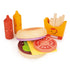 5 ekstra pommes frites i en træholder samt ketchup- og sennepsflasker.