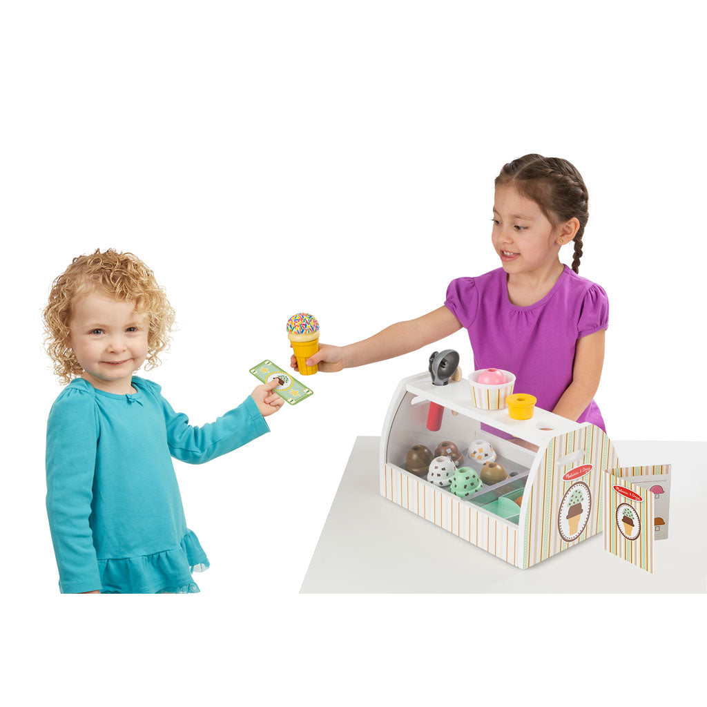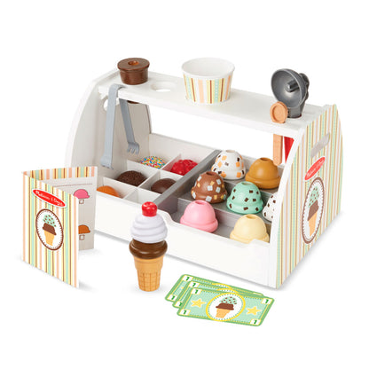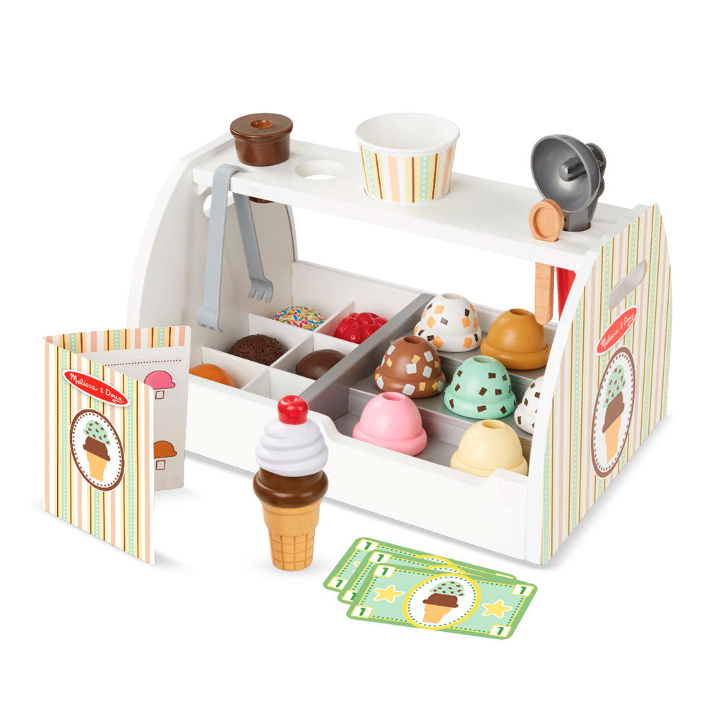 Inviter familie og venner på en lækker is fra denne flotte isbod i træ fra Melissa and Doug. Isboden indeholder bla. 8 forskellige is kugler i forskellige farver, og 6 forskellige toppings. På toppen af boden er der huller til de to medfølgende is vafler og skeer. Der medfølger også iskugleske, menu kort og bægre. Fra 3 år.
