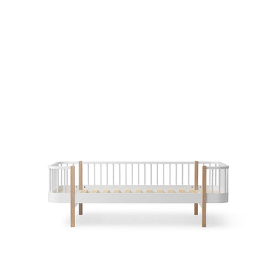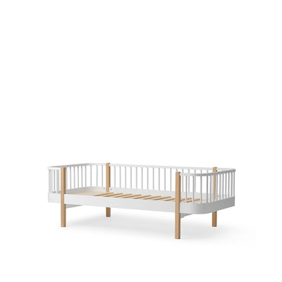 Flot Wood sofaseng fra Oliver Furniture - en moderne 50' klassiker med detaljer af nordisk eg. Wood sofaseng er den perfekte løsning i sommerhus eller på teenagerværelset, hvor den er mere end bare en seng, men også en siddeplads i dagtimerne. Er 100% dansk design, produceret i Europa. Sengen er i olieret eg, hvidlakeret birketræ og MDF E0 og E1. Mål: Sengens ydre mål er L: 207 x B: 97 x H: 69 cm.