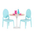 Et smukt bord og højryggede stole til dine Our Generation dukker. Flotte blå stole, der passer godt til det kridhvide bord. Der medfølger desuden vaser, dækkeservietter, bestik og servietter. Fra 3 år.