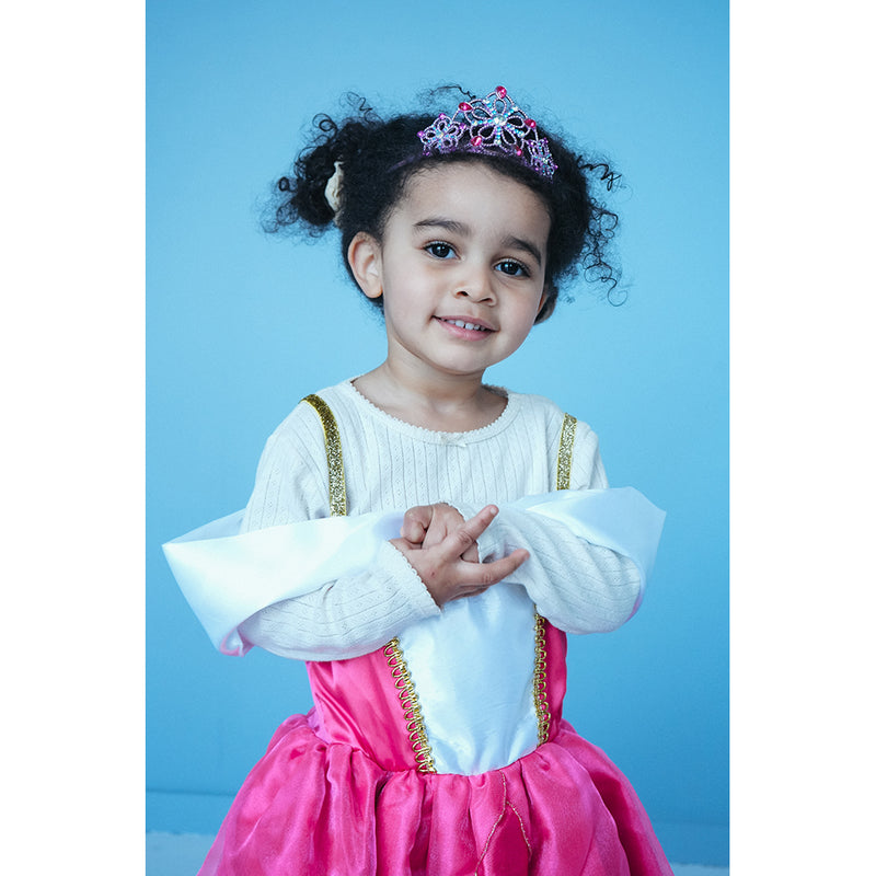 Sød prinsessekjole fra Great Pretenders til leg eller udklædning. Kjolen er med kort skørt i flere lag, og selve overdelen er med lave ærmer, guldfarvet bånd og hjerteformet perle. Fås i str. US 5-6 år.