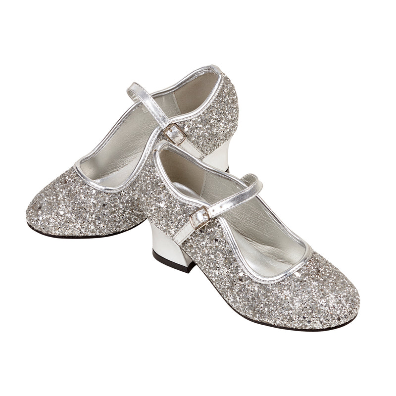 Yndige sko med mange små og fine detaljer, til hverdag, fest eller udklædning. De skinnende prinsessesko er i sølv metallic er m. høj hæl, og har rem omkring anklen, som gør at skoen sidder godt fast.