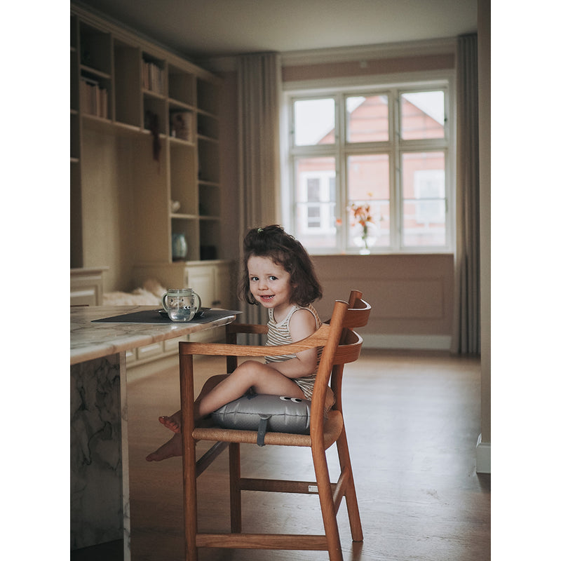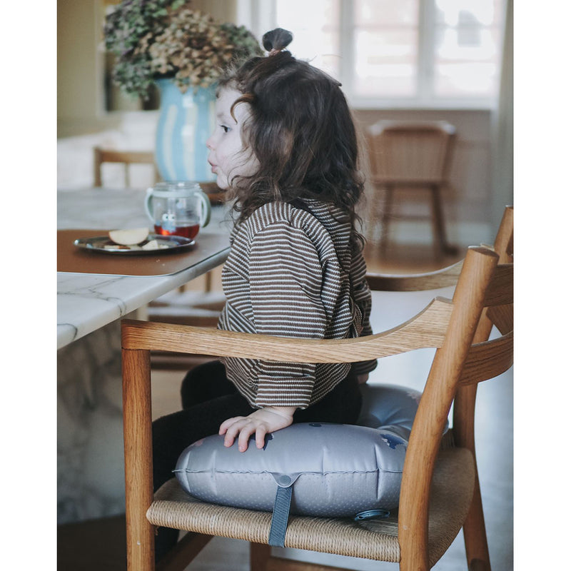 Praktisk oppustelig siddepude til børn - som er for store til højstolen, og for små til spisebordsstolen. Puden er designet i ergonomisk facon, med anti-slip prikker på undersiden samt elastikrem, som sikre puden holdes fast på enhver stol. Leveres i en lille nem taske til transport. Er nem at puste op, uden brug af pumpe. Anbefales fra 2 år.