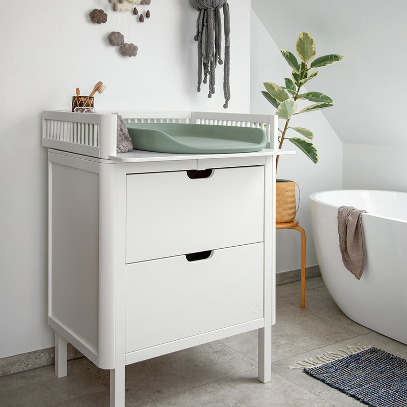 Gør bleskift til en hyggestund, med Sebra puslepude - her i farven Seagrass. Sebra puslepuden har en blød og vandafvisende overflade, som er let at rengøre. Den babynest-lignende form med høj kant vil hjælpe til med at forhindre, at dit barn triller ned fra puden. Den bløde kant sikrer samtidig, at det aktive barn, som er i bevægelse under bleskiftet, ikke slår hovedet imod en hård bagvæg eller puslebordets kant.