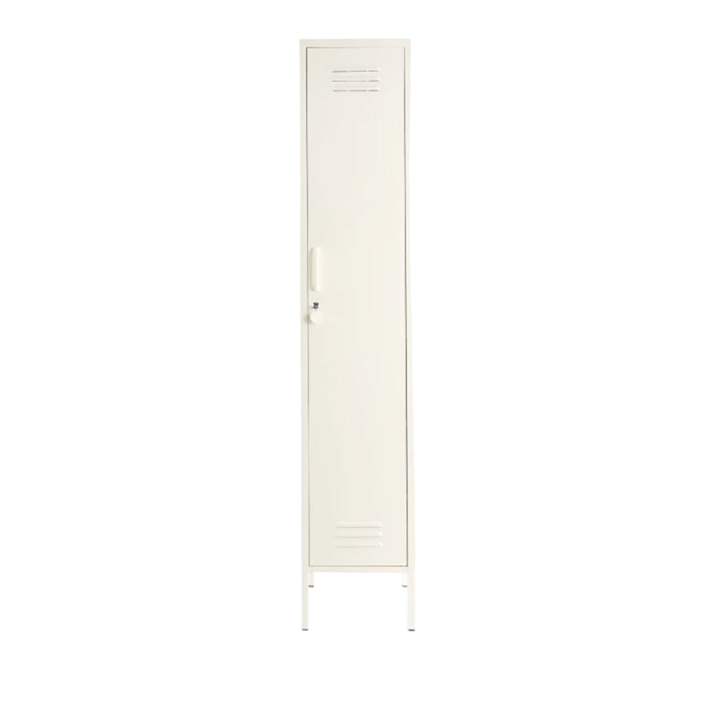 Metalskabet Skinny fra Mustard Made i tonen Sage udstråler ro og balance. Den lysegrønne nuance skaber en blid atmosfære, mens det ikoniske design leverer praktisk opbevaring. Perfekt i gangen, på kontoret eller i soveværelset. Skabet indeholder en bøjlestang, fire justerbare hylder og to kroge, og ydersiden fuldendes af Mustards kendetegn: håndtag, lås, nøglering og ventiler. Med sit matte, magnetiske finish er Sage både smuk og funktionel.
