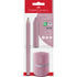 Viskelæderet er designet i trekantet facon med ergonomisk greb, som gør det muligt at viske meget præcist og blyantspidseren er dobbelt, så der kan spidses blyanter i både tynde og tykke størrelser.
