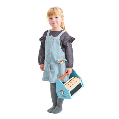 Værktøjskasse fyldt med alt, hvad den lille håndværker har brug for. Tavlen på den ene side af værktøjskassen, kan bruges til at nedskrive ideer til nye opfindelser. De to aftagelige låg bliver til plader, der kan skrues og hamres i. Alle smådelene kan pakkes sammen i den medfølgende stofpose. Indhold: Værktøjskasse med låg, spættehammer, tang, skruetrækker, svensknøgle, 2 spændplader, 4 skruer, 4 møtrikker og 4 pinde.
