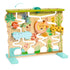 En sjov trælabyrint med skiver til børn fra 18 måneder. Barnet placerer skiverne i de tre åbninger øverst og lader dem glide ned ad banen. Undervejs bliver de stoppet af tre dyr – løven, giraffen og flodhesten – som barnet skal dreje, trække eller flytte for at give skiverne frit løb.