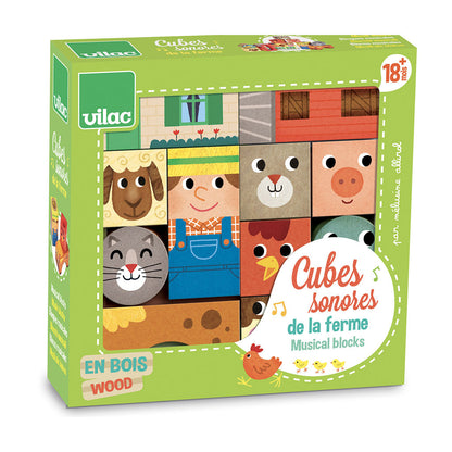 Lækre træklodser fra Vilac i flotte farver og med bondegårds tema, som kan stables på alverdens måder. Hver klods har en lyd, så ryster man dem - bliver de til rasle klodser.