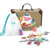 Indhold: 1 papkuffert og 50 træbrikker, en stofpose.