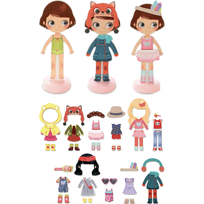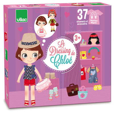 Den klassiske påklædningsdukke i et moderne udtryk. Lavet i træ med fod, så hun selv kan stå op, og magnetisk, så tøjet bliver siddende. Hun har flere smukke outfits både til sommer og til vinter, til skole og fritid. Sættet indeholder ialt 42 magnetiske dele: nederdele, kjoler, hatte og bukser. Chloe kan endda skifte frisurer. Fra 3 år.