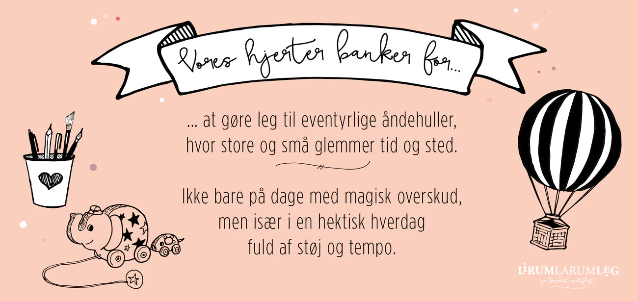 Hos Lirum Larum Leg er vi stolte af at kunne tilbyde et unikt og håndplukket udvalg, hvor kvalitet, funktionalitet og design går hånd i hånd. Vi lægger stor vægt på god service, hurtig levering og en nem shopping oplevelse. Det skal være nemt og trygt at finde det rigtige legetøj – uanset om du leder efter en barselsgave, fødselsdagsgave eller noget helt tredje.