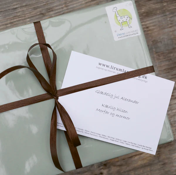 Når du har fundet den HELT rigtige gave har du mulighed for at vælge at få den pakket ind og få vedlagt et kort med din hilsen på.