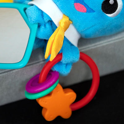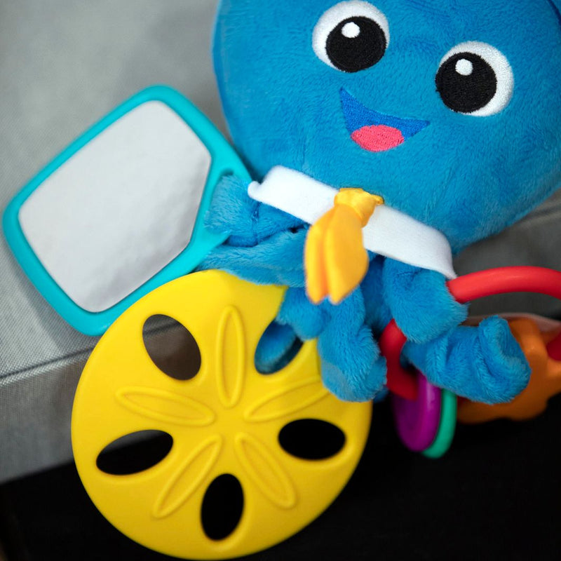 Blød farverig plysblæksprutte som du kan tage med på farten. På blæksprutten sidder der forskellige aktivitetsmuligheder fx et lille spejl og en rangle. Den kan også monnteres fast til enten barnevognen eller autostolen.