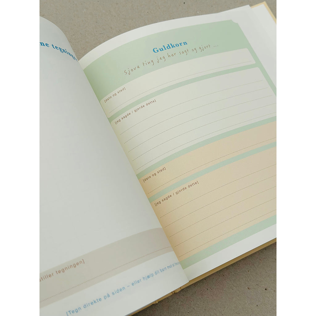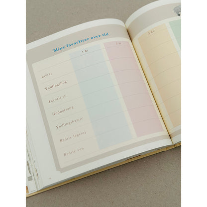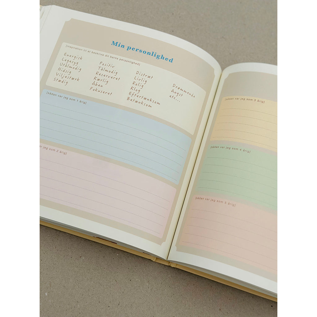 Bogen udfyldes af forælderen med historier og anekdoter om barnet, billeder fra årernes løb, hånd- og fodaftryk, stamtræ osv. fra barnets første 5 leveår.