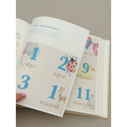Derudover er der i bogen milepælekort, som kan klippes ud og anvendes til fotos. Der er også et par fine aktivitetssider midt i bogen, som gør at bogen bliver relevant at tage frem og kigge i sammen med barnet – på den måde husker man at få bogen frem jævnligt og få siderne udfyldt, og barnet bliver bevidst om, at bogen eksisterer.
