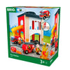 Dette sæt måler 39 x 34 x 19 cm og indeholder brandstation, bandbil med stigevogn, motorsav, skinne, 2 brandmænd m.m. I alt 12 dele. Brandbilen har lyd og lys som virker med 2 x LR44 batterier som medfølger. Sættet er kompatibel med klassiske trætogbaner fra Brio, og er del af serie med brandmandstema og redningsaktioner.  Fra 3 år.