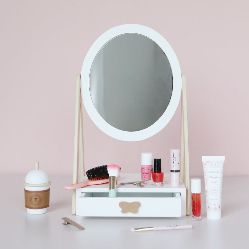 Sødt lille bordspejl fra By Astrup m. skuffe til smykker, børnesminke og hårpynt. Passer perfekt ind på pigeværelset, til brug i rolleleg, ved udklædning eller når håret skal sættes. Bordspejlet er fremstillet i træl og akryl og måler 25 x 17 x 36 cm. Fra 3 år.