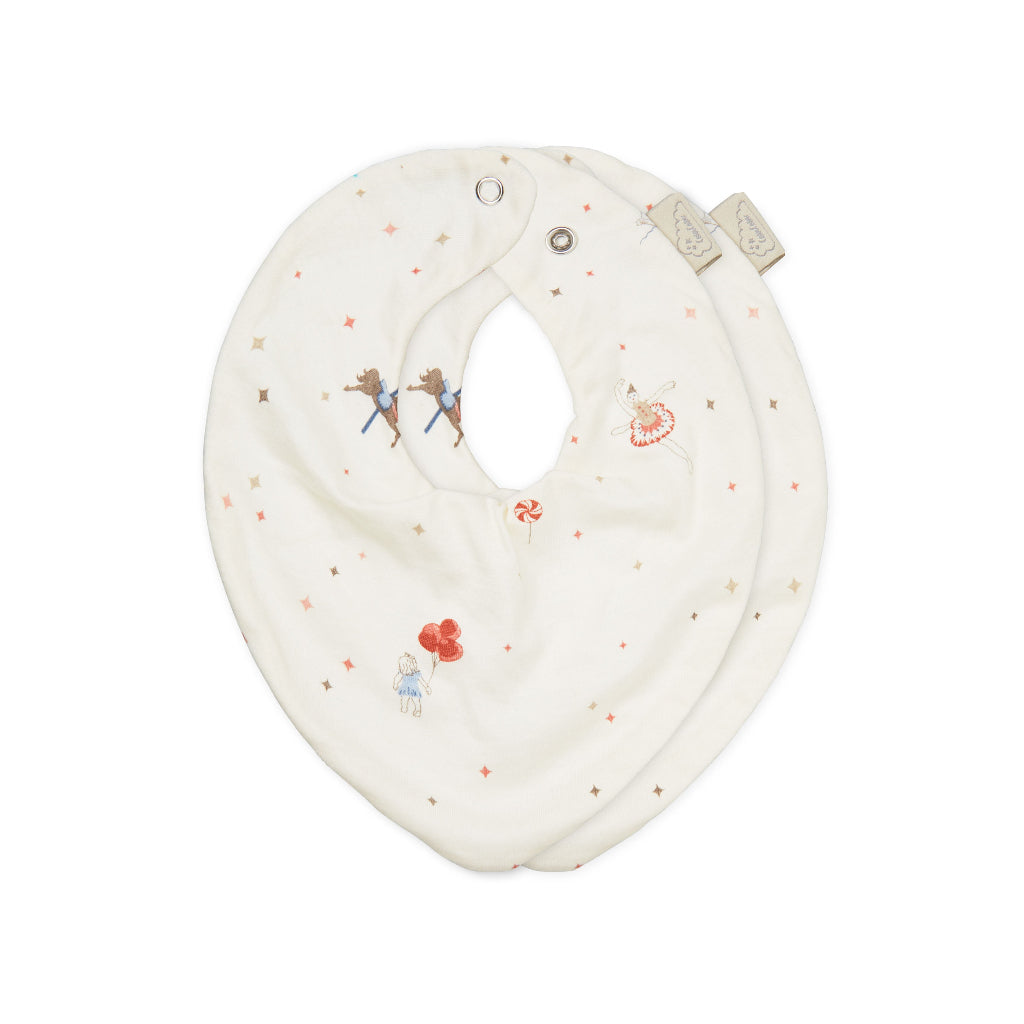 Søde og praktiske bandana-hagesmække fra Cam Cam i 2-pak med det fine Carousel-print med karruseller i afdæmpede farver. Hagesmækkene er fremstillet i blød, strækbar jersey og har to trykknapper, så de kan justeres i størrelsen. Perfekte til både måltider og savleperioder.