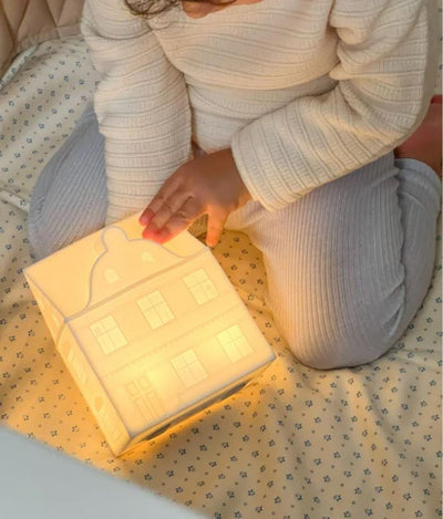 Skab en hyggelig og rolig stemning på børneværelset med Cam Cams' charmerende København Natlampe, inspireret af de klassiske københavnske byhuse. Med sine fine, detaljerede elementer- som en gravid kvinde i vinduet, en hund på gaden og en cykel foran huset, inviterer lampen til historiefortælling og fantasi.