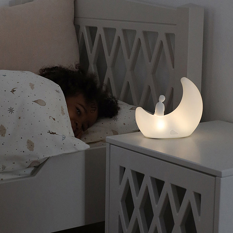 Rigtig fin natlampe fra Cam Cam, i form som måne med en siddende dreng. Natlampen skaber en drømmende atmosfære med sit varme og bløde lys, og vil sikkert inspirere til eventyrlige og fortryllende drømme. Lampen er perfekt til brug ved puslebordet eller natspisning, eller til børn som har brug for lys når de skal sove.