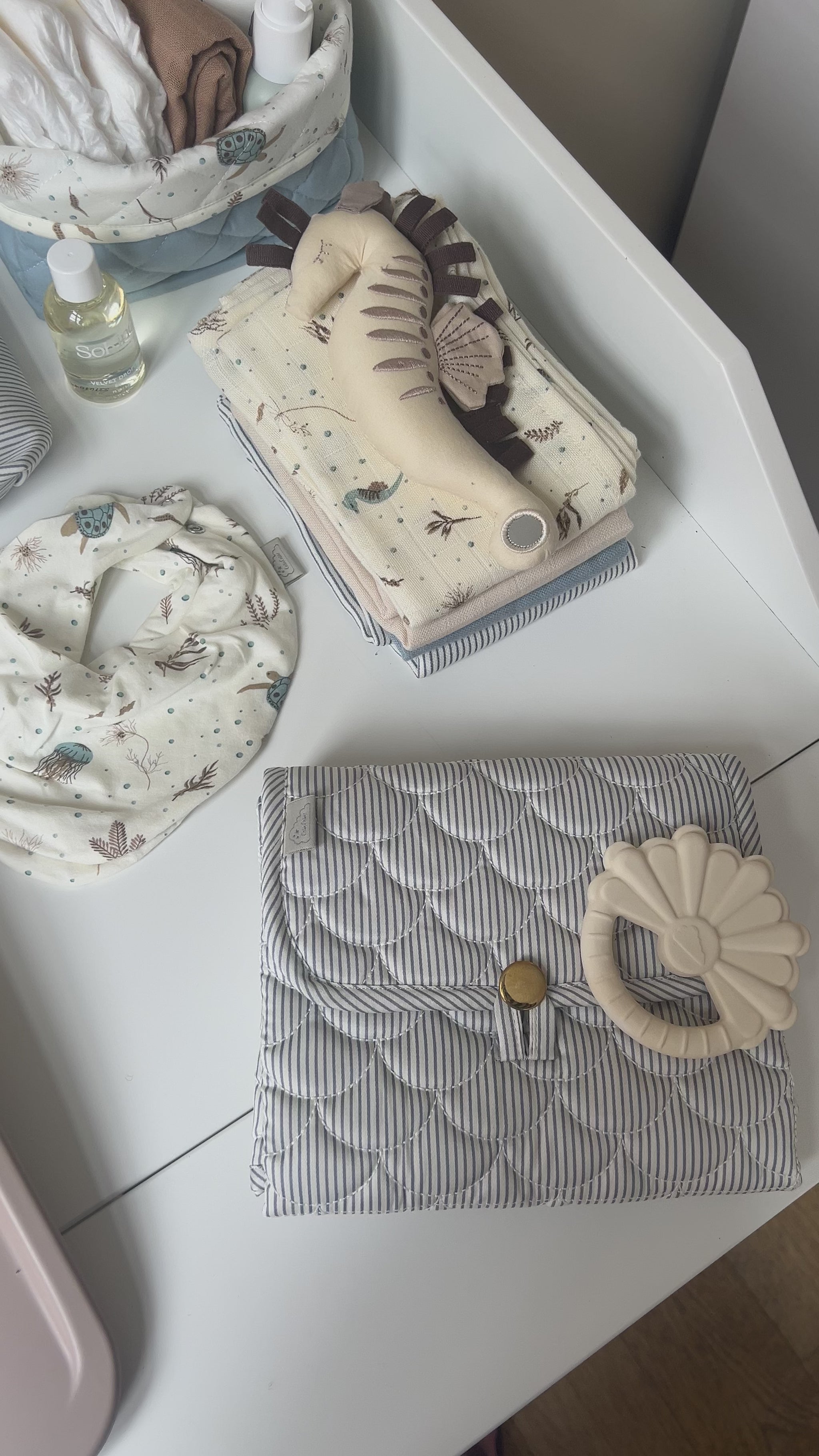 Quilted Charging Mat fra Cam Cam Copenhagen i printet Classic Stripes Blue / Praline er et blødt og praktisk pusleunderlag, perfekt til både hjemmebrug og på farten. Det quiltede design giver en behagelig overflade for barnet og et smukt, roligt udtryk.