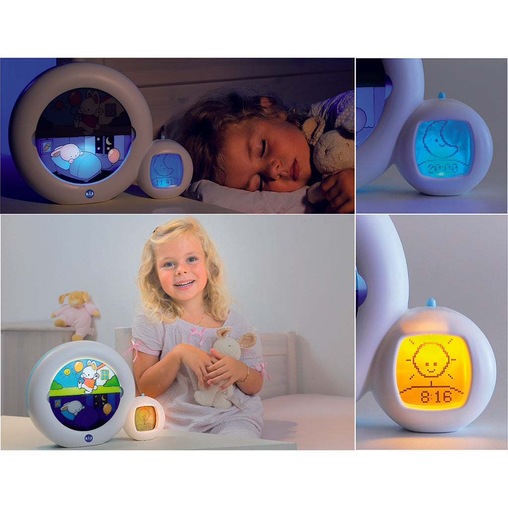 Nat uret indstilles (efter dit valg) så natten starter f.eks. kl. 20:00 hvor lyset kommer frem ved den sovende kanin. Dagen indstilles til at starte f.eks. kl. 7:00 – det betyder at når kl. bliver 7:00 skifter lyset i uret således at den lille glade kanin er vågen og med ballon i hånden. Du skal dermed på en simpel måde forklare barnet, at når den nye ven ”kaninen” sover – så skal barnet også sove og hvis barnet vågner og ser at kaninen sover – så er det stadigvæk nat. Når kaninen vågner, betyder det, at det er blevet morgen og tid til at stå op.