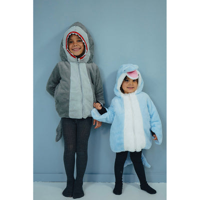 Skøn lille jakke til leg og udklædning som haj. Jakken har påsyet hætte hvor på der er "næb". Lukkes foran med velcro og har elastikker i siderne. Fås i str. 2-4 år ( 98-104 cm)