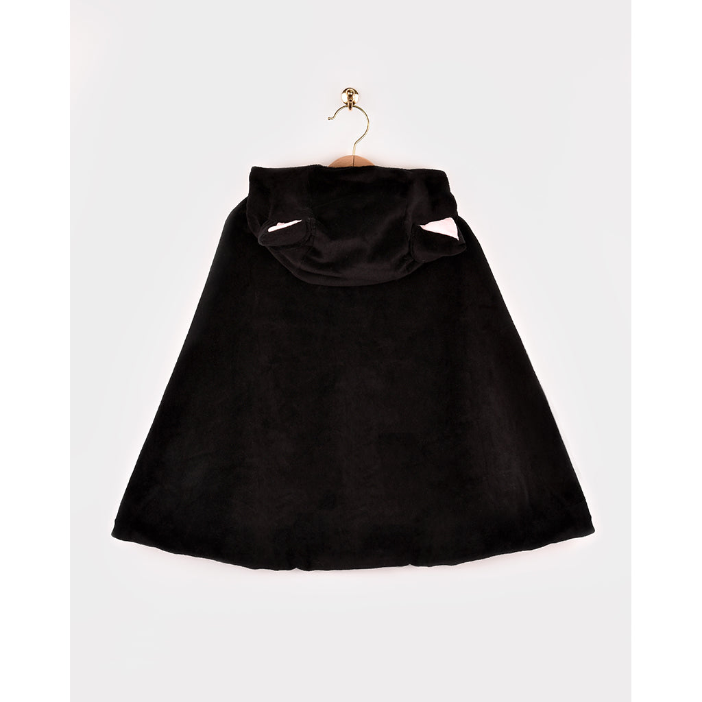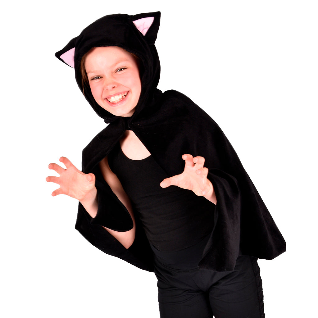 Flot sort kattekappe til leg og udklædning. Kappen har påsyet hætte med polstret øre. Lukkes foran med velcro. Fås i str. 38 år ( 104-128 cm)