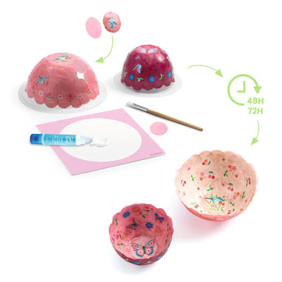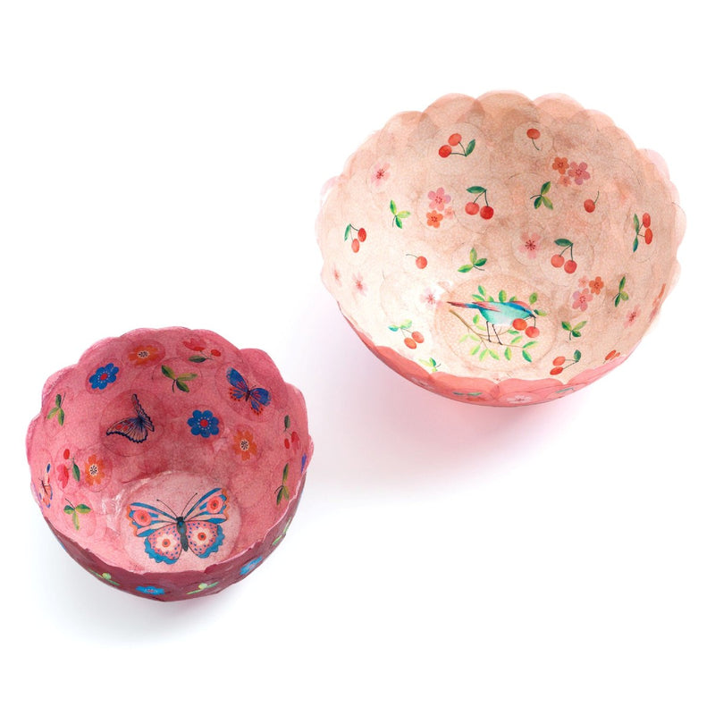 Med denne pakke kan du lave to flotte skåle i papir. Skålene laves over de hvide plastik forme, hvor de runde papirstykker limes på. Når papirskålen har tørret tages den af, og dekoreres færdigt indvendigt.