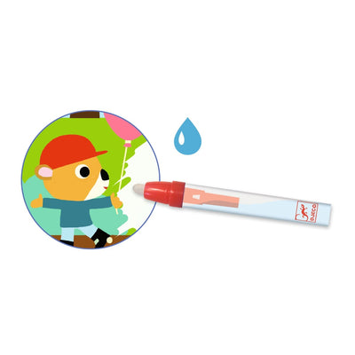 Sødt kreativt sæt til de mindste fra Djeco. 4 søde billeder med fantasifulde dyremotiver fra Djeco, der bringes til live med lidt vand. Fyld pennen op med vand og lad barnet slå sig løs. Med få strøg over billedet træder der pludselig flotte farver frem.