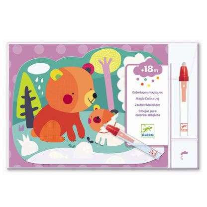 Magisk farvelægning for de mindste fra Djeco. Dette sæt består af 4 skønne billeder, som blot bliver endnu flottere med vand. Fyld den medfølgende pen op med vand og lad barnet slå sig løs. Med få strøg over billeder, kommer der fine mønstre og farver frem. Når vandet er tørret ind forsvinder farverne igen, og man kan starte forfra. Fra 18 mdr.