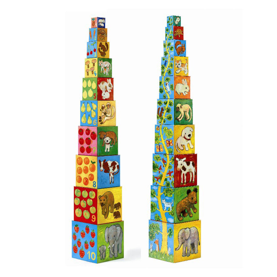 Det lidt større barn kan bruge stabelklodserne som en slags puslespil når klodserne stables. Klodserne fra Djeco har de fineste tegninger af dyr og elementer fra naturen, samt tallene 1-10. Er fremstillet i kraftig pap der tåler at blive rengjort med en fugtig klud.